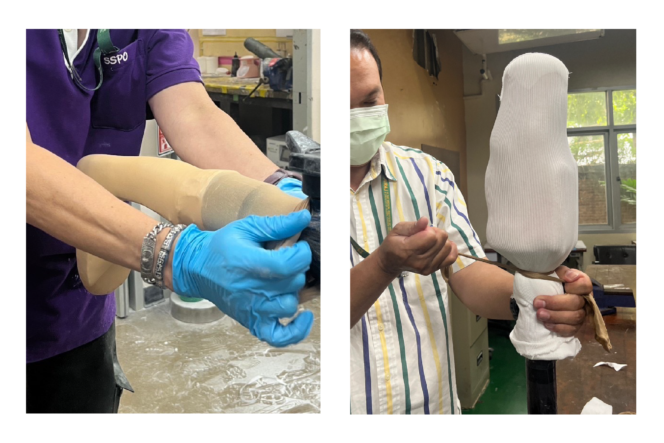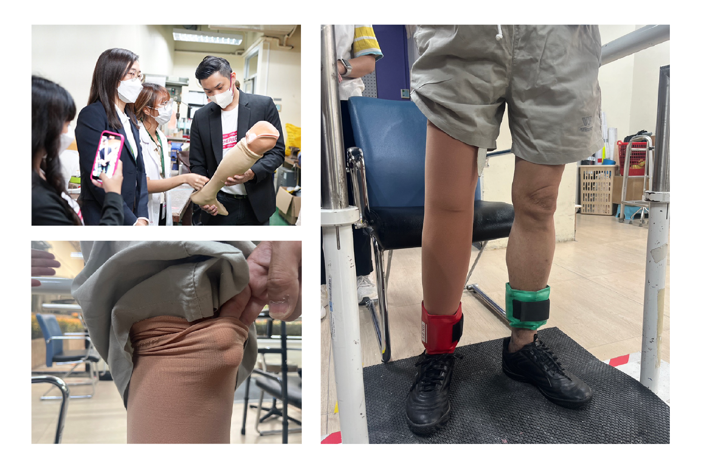 เศษถุงน่องจะนำมาใช้แทนเชือกในการรัดอุปกรณ์ต่าง ๆ ก่อนขึ้นรูปเพราะถุงน่องมีคุณสมบัติในเรื่องของความยืดหยุ่นสูง สามารถดึงให้เรียบตึง ไม่ย่นจนการเทปูน เสียรูปทรง ทำให้สามารถหล่อปูน หรือขึ้นรูปเรซิ่นของกายอุปกรณ์เทียมได้สะดวกยิ่งขึ้น