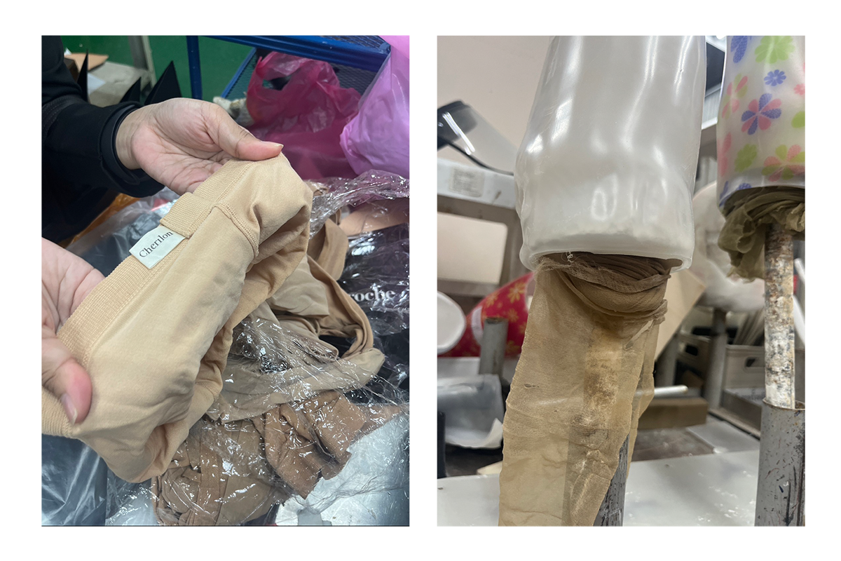 ถุงน่องที่ผ่านการใช้งานแล้ว หรือถุงน่องมือสองจะนำไปใช้ในส่วนของขั้นตอนการผลิตทางเทคนิค ที่เรียกว่า การขึ้นรูปพลาสติก นักกายอุปกรณ์จะใช้ถุงน่องมาสวมบนหุ่นปูนพลาสเตอร์ที่หล่อมาจากขาของคนไข้ ก่อนจะนำแผ่นพลาสติกที่อบด้วยความร้อนเกิน 200 องศา มาห่อหุ้มอีกชั้นเพื่อให้สามารถขึ้นรูปพลาสติกด้วยเครื่องดูดระบบสูญญากาศได้ เนื่องจากถุงน่องทำหน้าที่เป็นทางผ่านของอากาศบนผิวของหุ่นปูน ทำให้ดูดอากาศออกได้ดี อุปกรณ์พลาสติกจึงได้รูปร่างของต้นแบบจาก mold หุ่นปูนแต่ละชิ้นอย่างสวยงาม และตรงตามสรีระคนไข้